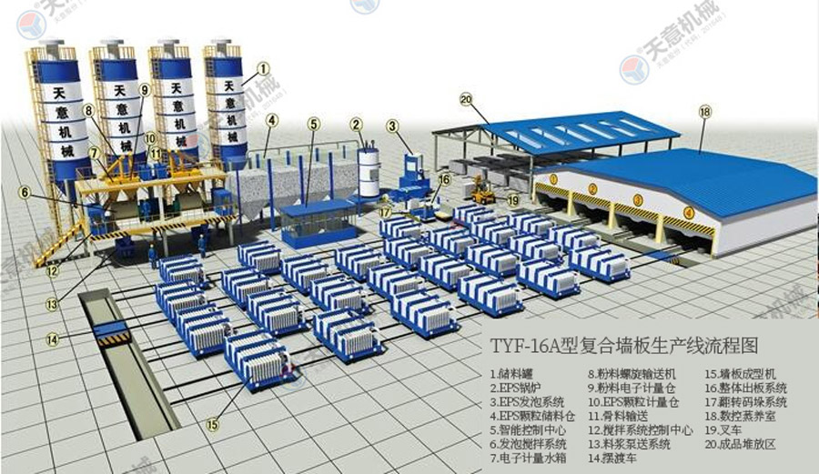 TY12型墻板生產(chǎn)線(xiàn)包括:墻板成型機(jī)、整體穿抽管系統(tǒng)、發(fā)泡系統(tǒng)、水箱、電子計(jì)量?jī)?chǔ)料倉(cāng)、螺旋上料輸送機(jī)、儲(chǔ)料罐、螺旋輸送機(jī)、EPS熟化料倉(cāng)、硫化干燥床、EPS預(yù)發(fā)機(jī)、數(shù)控配電室、發(fā)泡攪拌機(jī)、整體出板系統(tǒng)、叉車(chē)、成品堆放區(qū)、擺渡車(chē)。