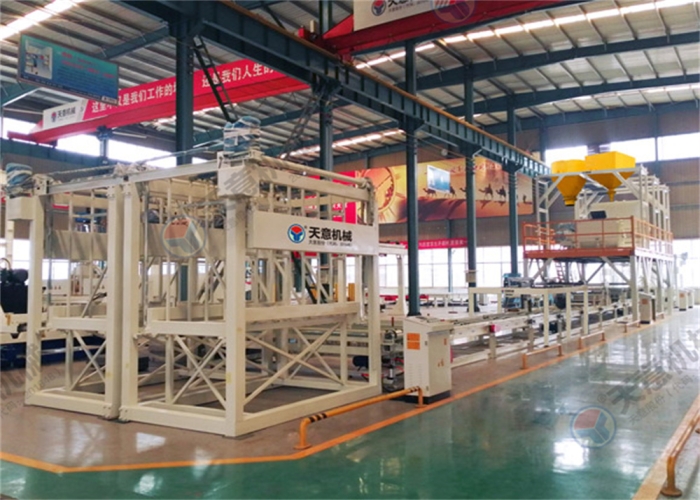 成型輸送線主要由上板輸送線、成型輸送線,加速整理輸送線及送板主機、布料主機、刮平裝置、玻纖網(wǎng)格布架等組成,主要功能是把漿料鋪設在EPS基板上并完成產(chǎn)品的成型,且輔助完成兩端雙工位碼垛機的上下架。
